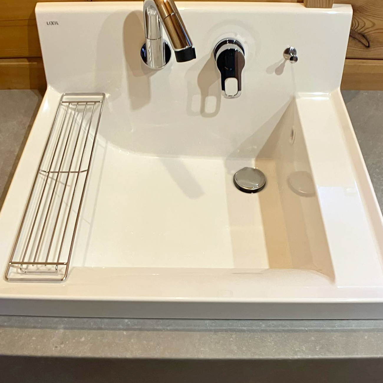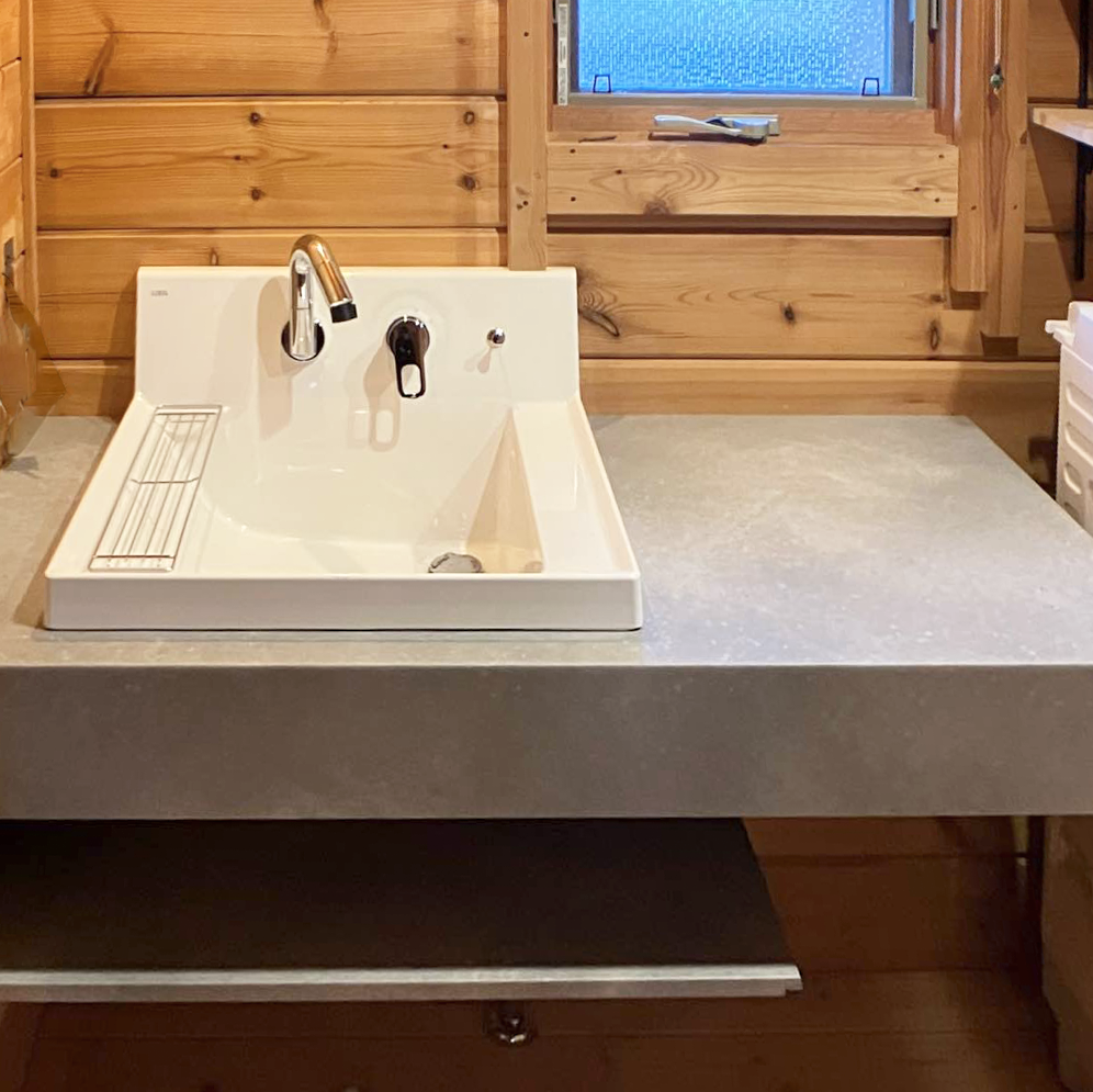 ログハウスのおしゃれな住宅に合わせ、「デザイン性の高い洗面化粧台にしたい」というご要望をいただきました。そこでご提案させていただいたのが、LIXILのカスタムバニティです。この製品は、まるで注文住宅のように、お客様の理想とするデザインに合わせた造作風の洗面化粧台を実現できるのが最大の魅力です。